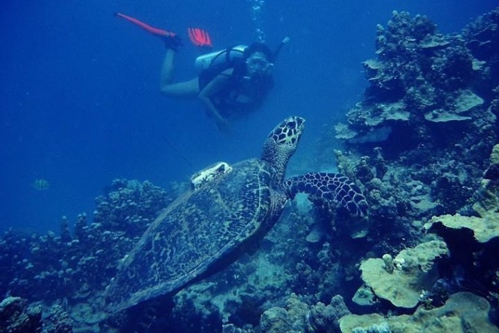 Dogleg Reef is famous for its calm waters with numerous coral reefs and tropical fish surrounded by a sand bottom, with some 75-year-old artifacts from WWII scattered about down deeper for advanced divers. There are resident green sea and hawksbill turtles in the area, so they are a common sight on most dives.